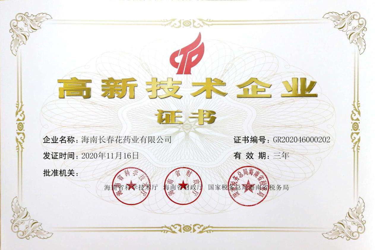 熱烈祝賀海南長(zhǎng)春花藥業(yè)有限公司獲得高新技術(shù)企業(yè)證書