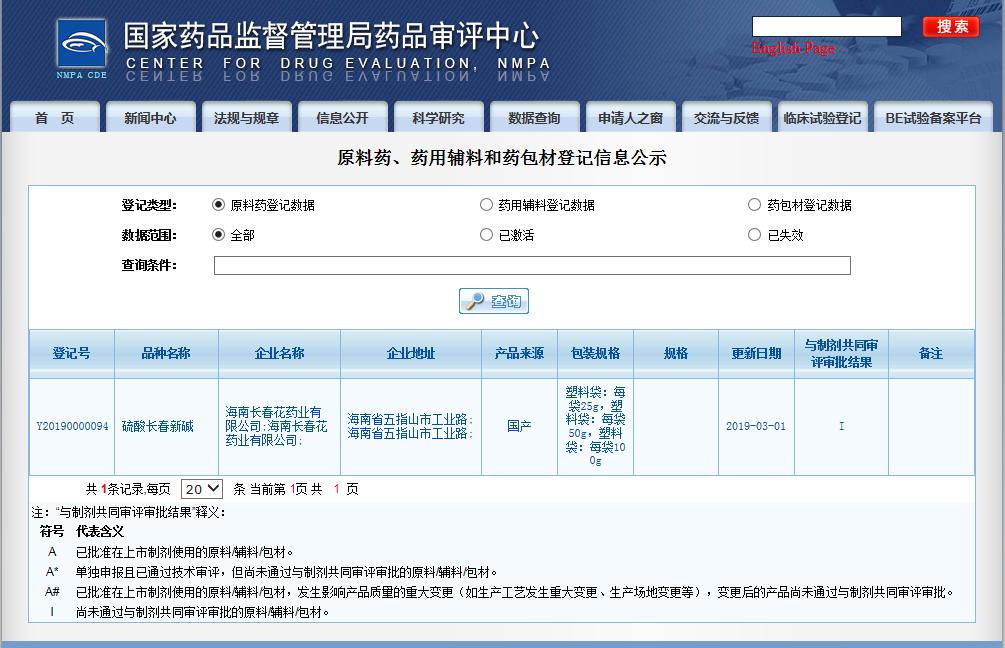 海南長春花藥業(yè)旗下的“硫酸長春新堿”原料藥于2019年3月1日獲得國家食品藥品監(jiān)督管理總局備案登記號(登記號:Y20190000094 )。